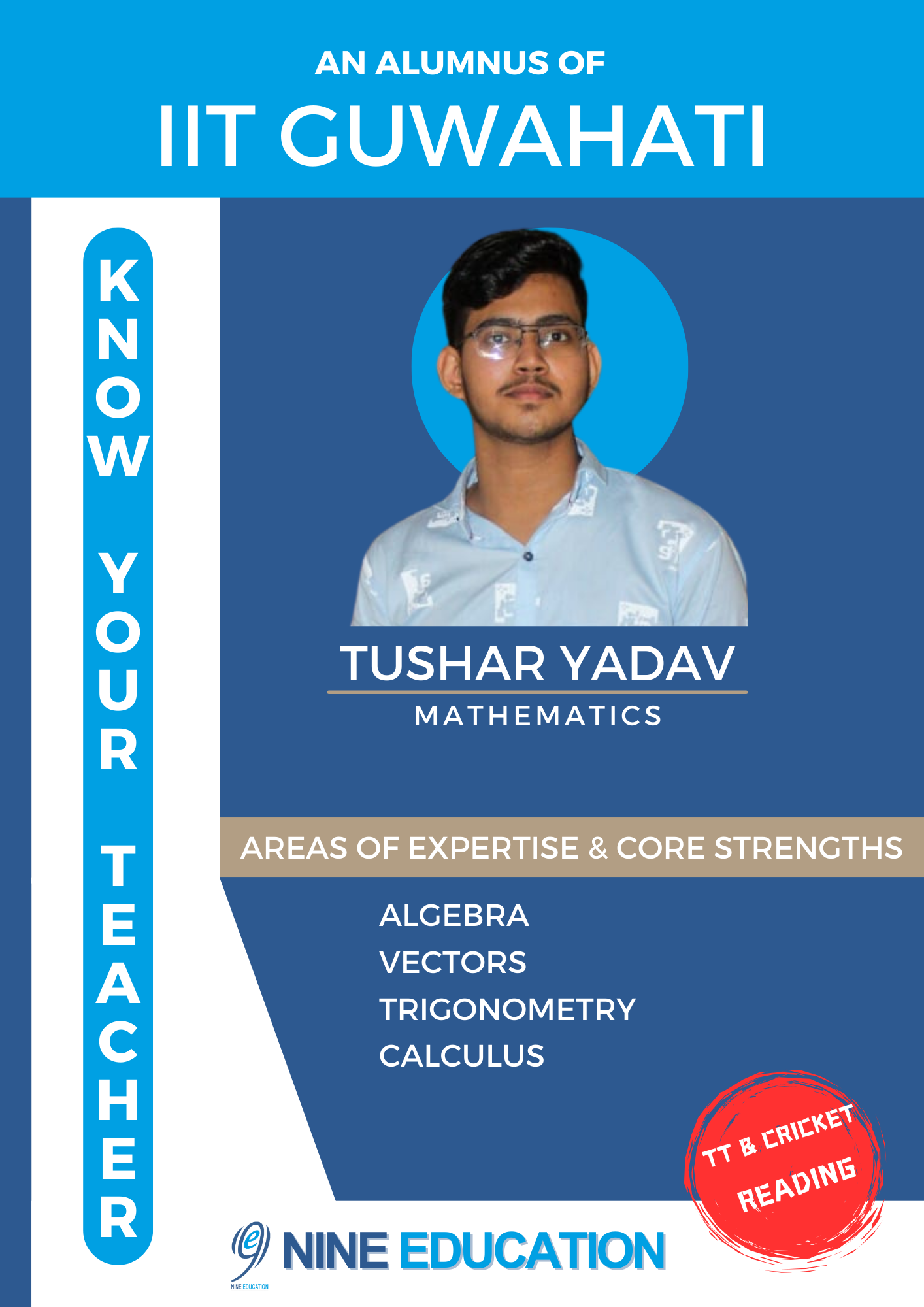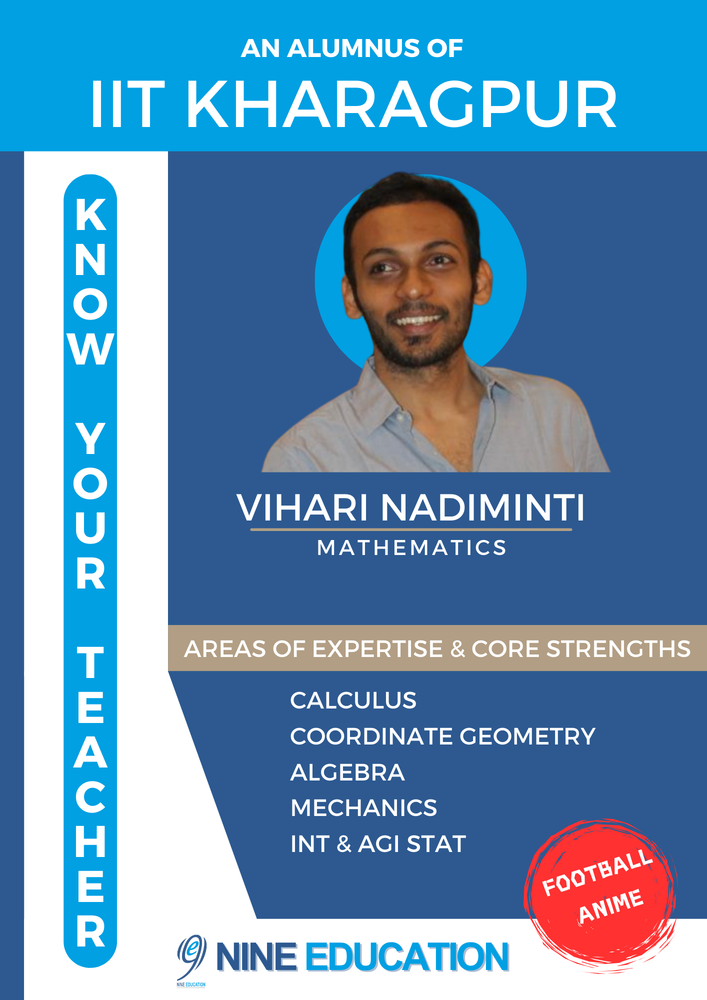 Mr. Vihari Nadiminti, an alumnus of IIT Kharagpur and branch director at Nine Education’s Neredmet branch, stands out as an inspiring mentor with a deep love for cultivating curiosity in young minds. As a mathematics educator, he believes in transforming the world of numbers into a realm of wonder and discovery through individualized guidance and support.